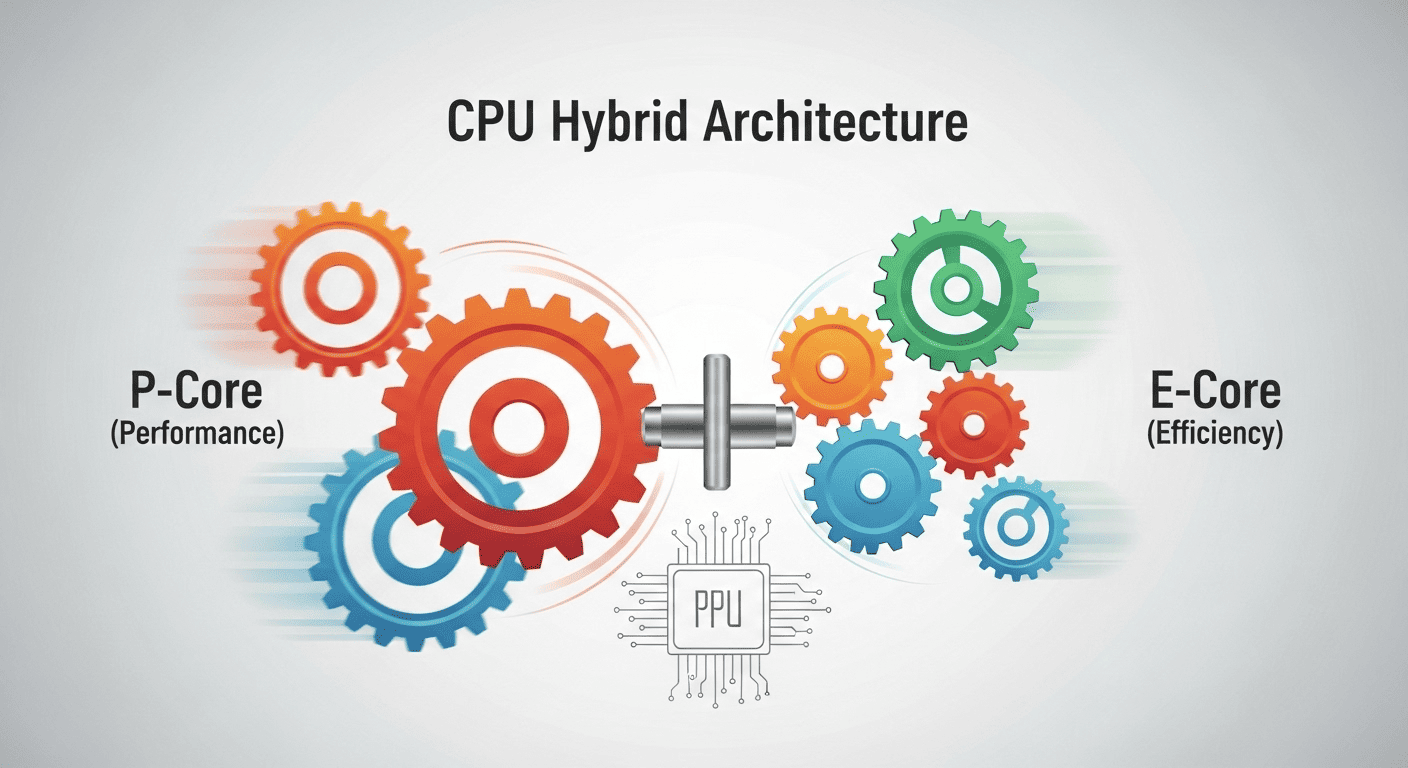 以前は単純に「コア」と呼ばれる計算回路の数が多いほど高性能とされていましたが、最近は「ハイブリッド・アーキテクチャ」が主流です。これは、高い性能を出すための「Pコア(高性能コア)」と、消費電力を抑えるための「Eコア(高効率コア)」を組み合わせる技術です。これにより、動画編集のような重い作業はPコアが、Web閲覧などの軽い作業はEコアが担当し、パワフルさと省電力を両立させています。