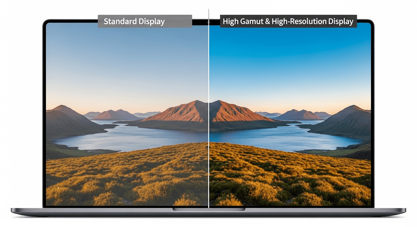 また、一般的な用途でも、この数値が高いと写真や動画がより鮮やかに見え、満足度が高まります。PCで映画を観ることが多い方も、できるだけ色域の広いディスプレイを搭載したノートPCがお勧めです。