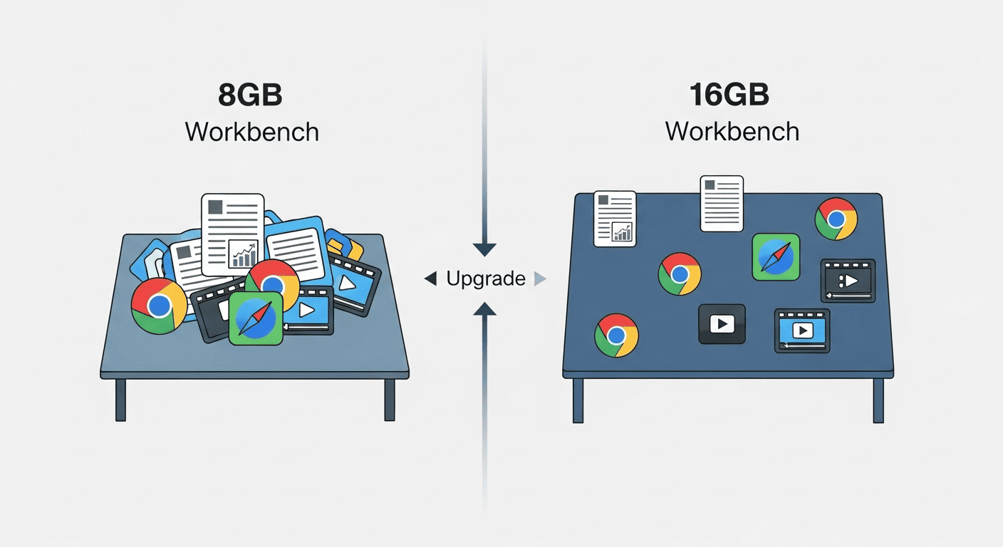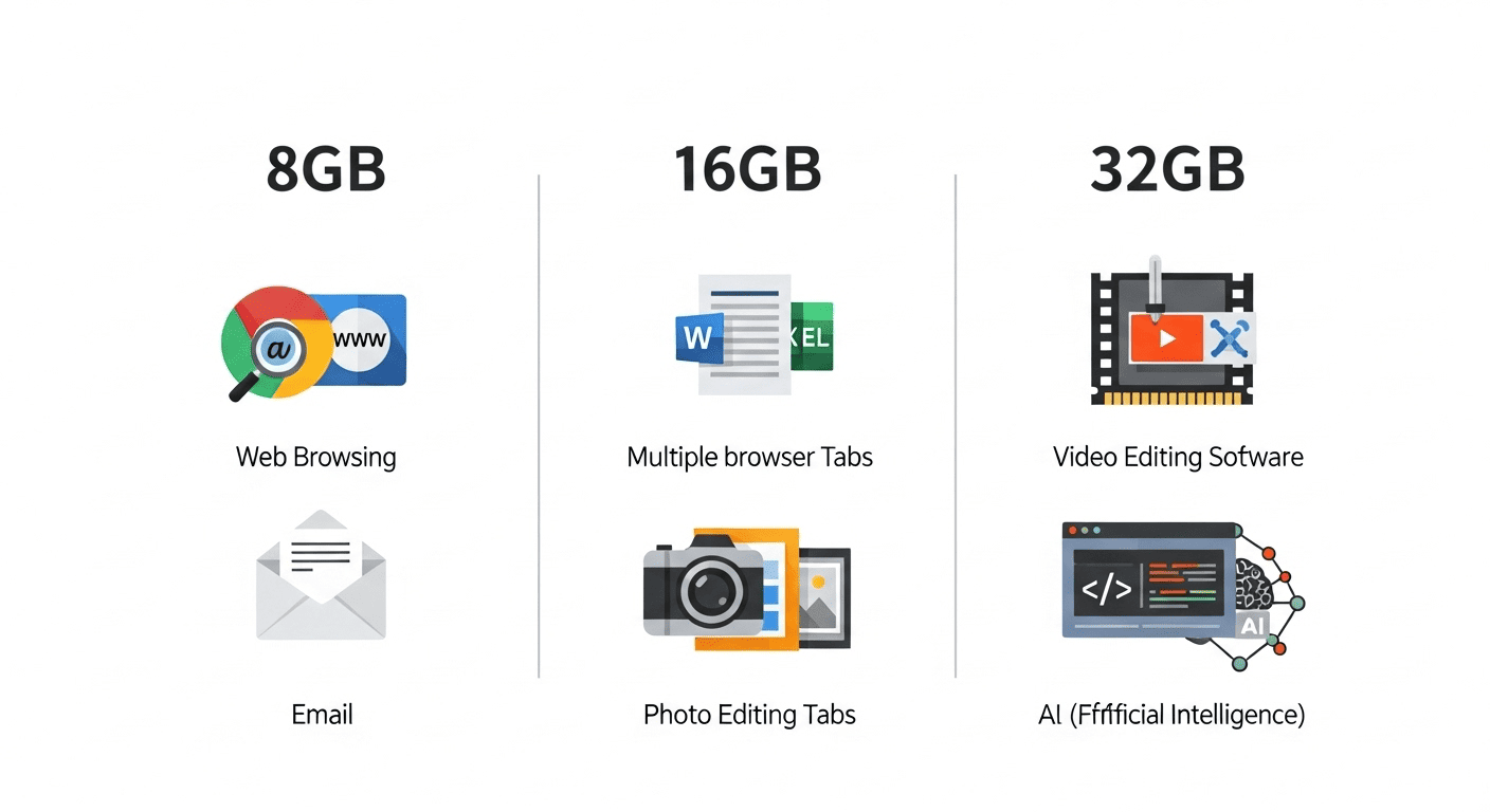 - 8GB: 用途をWeb閲覧やメールなどに限定するなら選択肢になりますが、複数のアプリを同時に使うと動作が遅くなる可能性があります。長く快適に使うなら16GB以上をおすすめします。