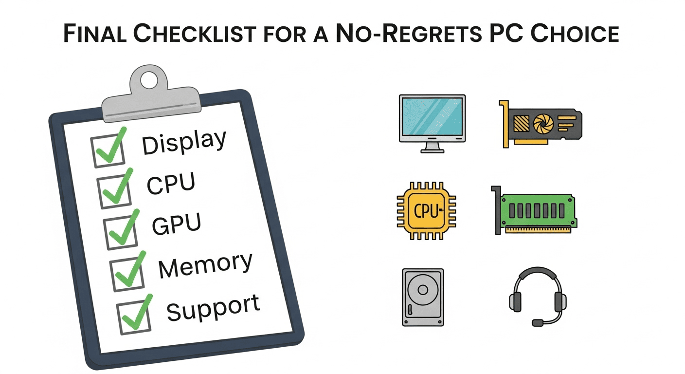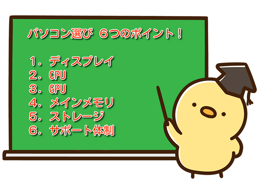 パソコンは多くのパーツから成り立っていますが、全てを完璧に理解する必要はありません。特に重要な「ディスプレイ」「CPU」「GPU」「メインメモリ」「ストレージ」「サポート体制」の6つを押さえるだけで、自分に合ったパソコンを格段に見つけやすくなります。