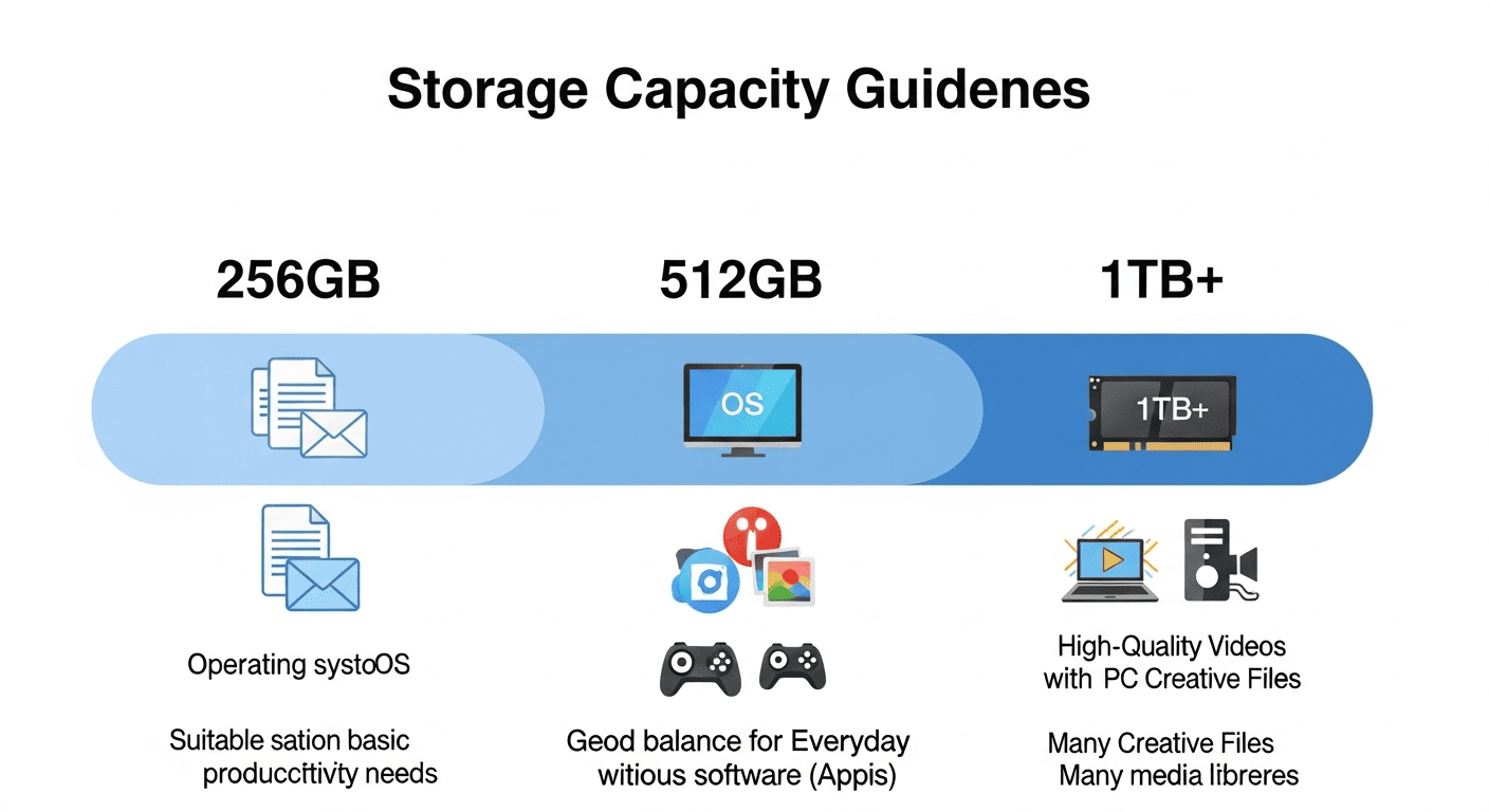 - 512GB: 現在の標準的な容量です。OSやアプリ、書類、多少の写真や動画を保存しても十分な空き容量を確保できます。ほとんどの方にとって、まずこの容量が目安になります。