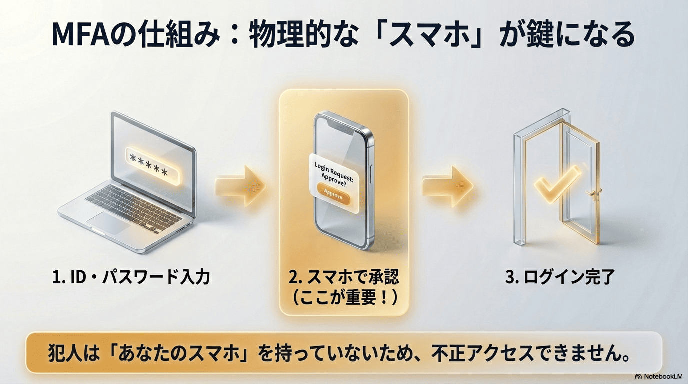この仕組みがあれば、たとえパスワードが盗まれても、犯人は「あなたのスマホ」を持っていないため、不正アクセスを阻止できるのです。