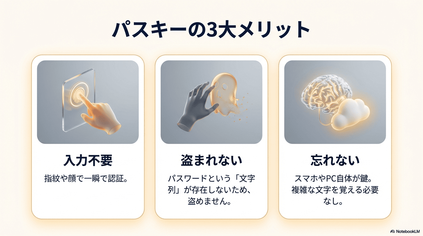 - 盗まれる心配がない:パスワードという「文字列」自体が存在しないため、盗まれるリスクがありません。
