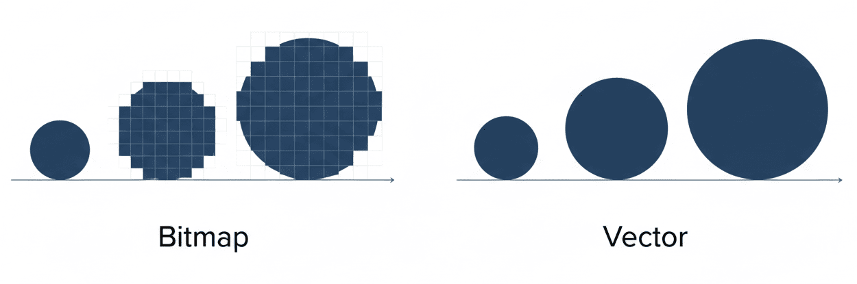 SVGはただの設計図なので、画像のサイズを10倍に拡大するよう指示されても、デバイス側が「じゃあ半径を10倍にして描き直そう」と再計算するだけです。そのため、ビットマップのように「1つの点を無理やり引き延ばす」という概念がなく、常にシャープな状態を保てます。