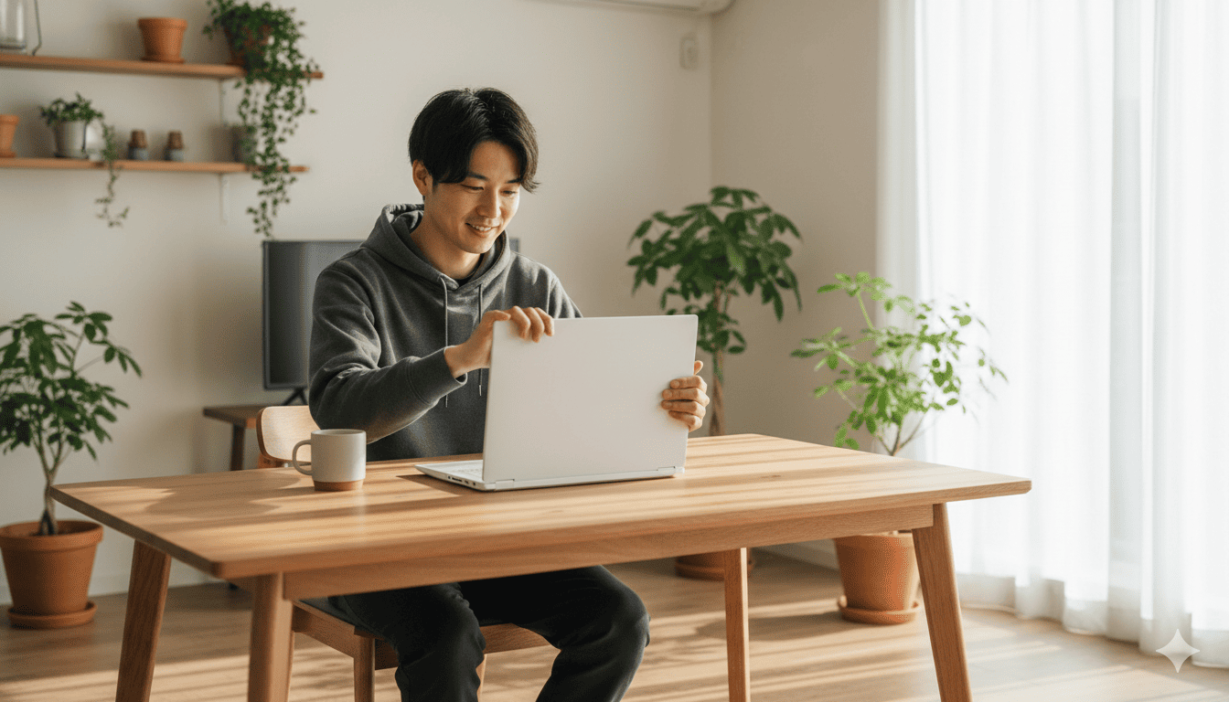週末の朝、白い筐体のノートPCをリビングテーブルに開きます。家族がくつろぐ空間で、最新のゲームタイトルを165Hzの滑らかな映像で楽しむ。洗練されたデザインはインテリアに自然と溶け込み、家族からも好評です。