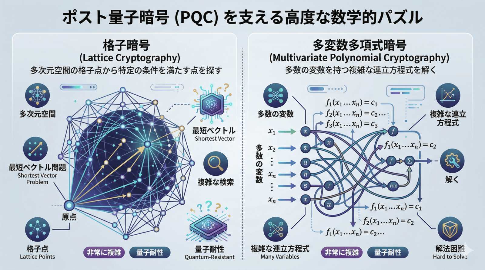ポスト量子暗号(Post-Quantum Cryptography: PQC)とは、「量子コンピュータでも解くことが困難な、新しい数学的アルゴリズムを用いた暗号」のことです。