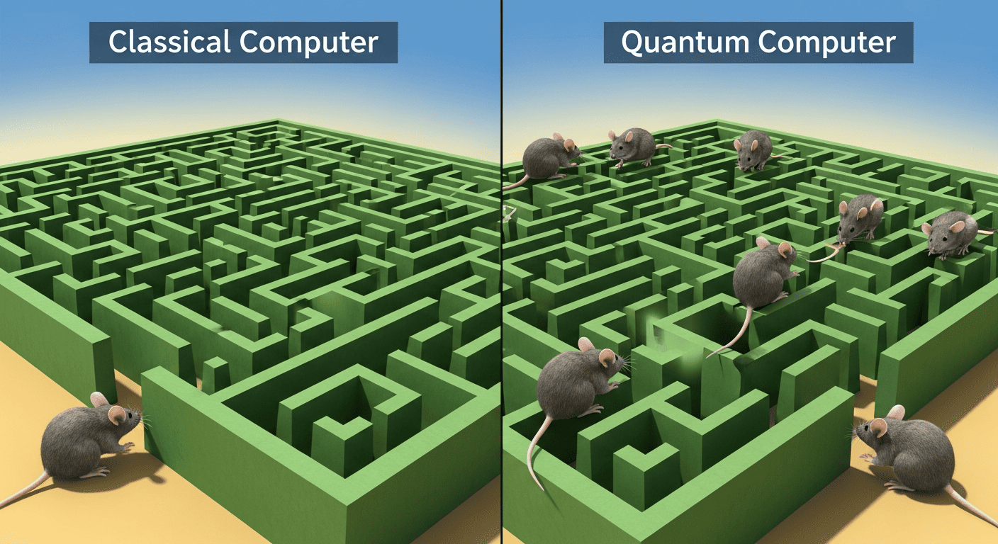 量子コンピュータ(右)は、一匹のマウスが分身して処理する。
