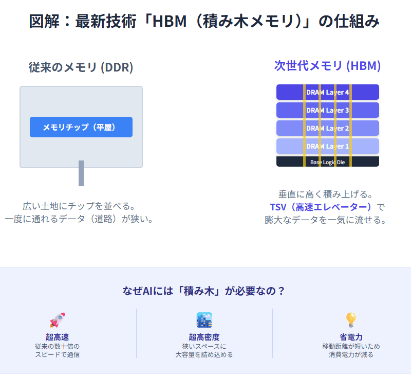 AIをより速く動かすためには「HBM(高帯域幅メモリ)」という新しいタイプのメモリが使われています。HBMは、これまでの平べったいメモリチップを「積み木のように垂直に積み重ねた」ものです。